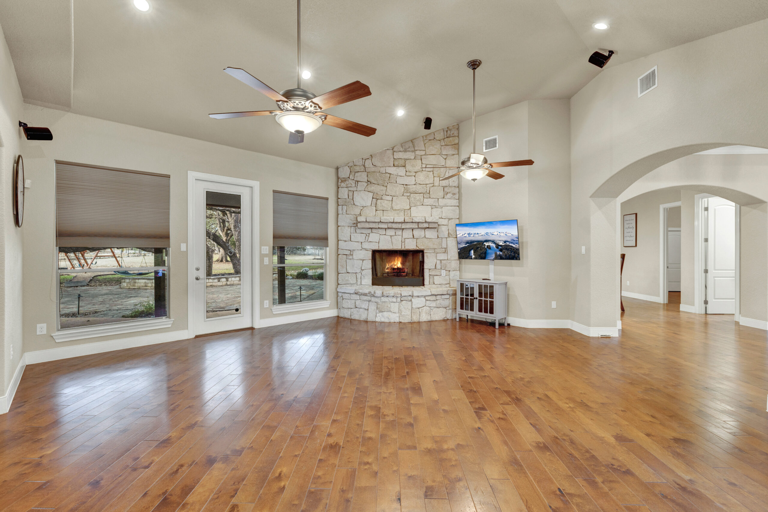 Floor-to-ceiling stone fireplace in living area