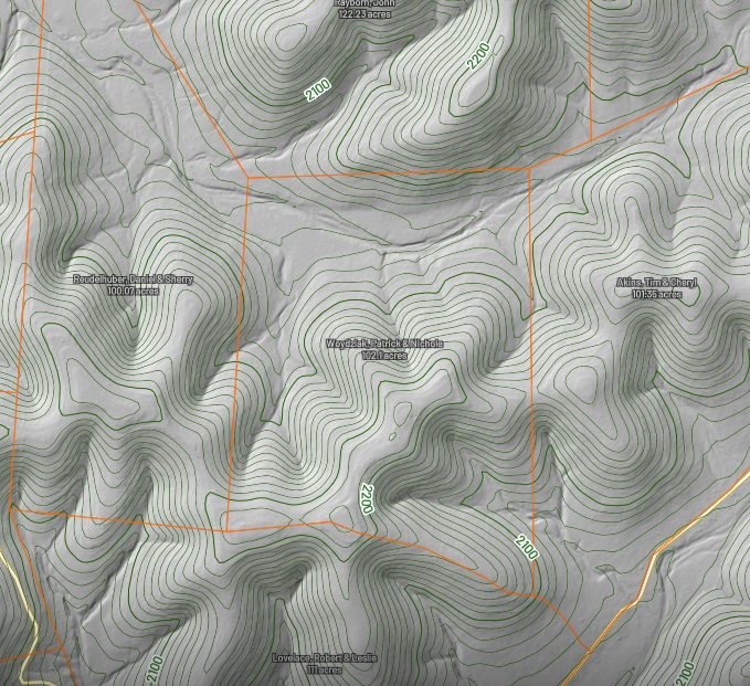 Topography: Elevation from 2,060′ to 2,220′. Hilltop views, dry creek bed, and flat valley areas
