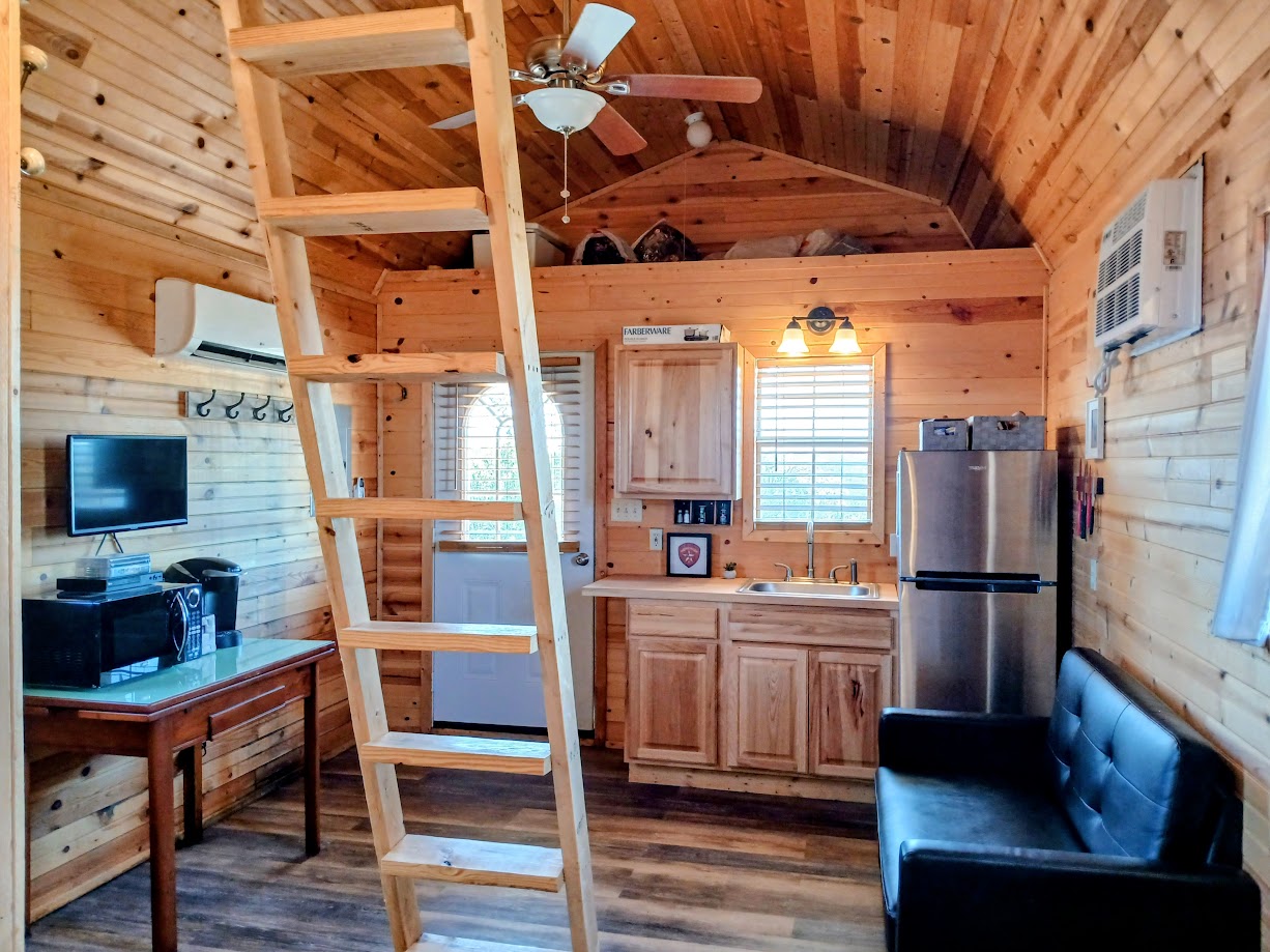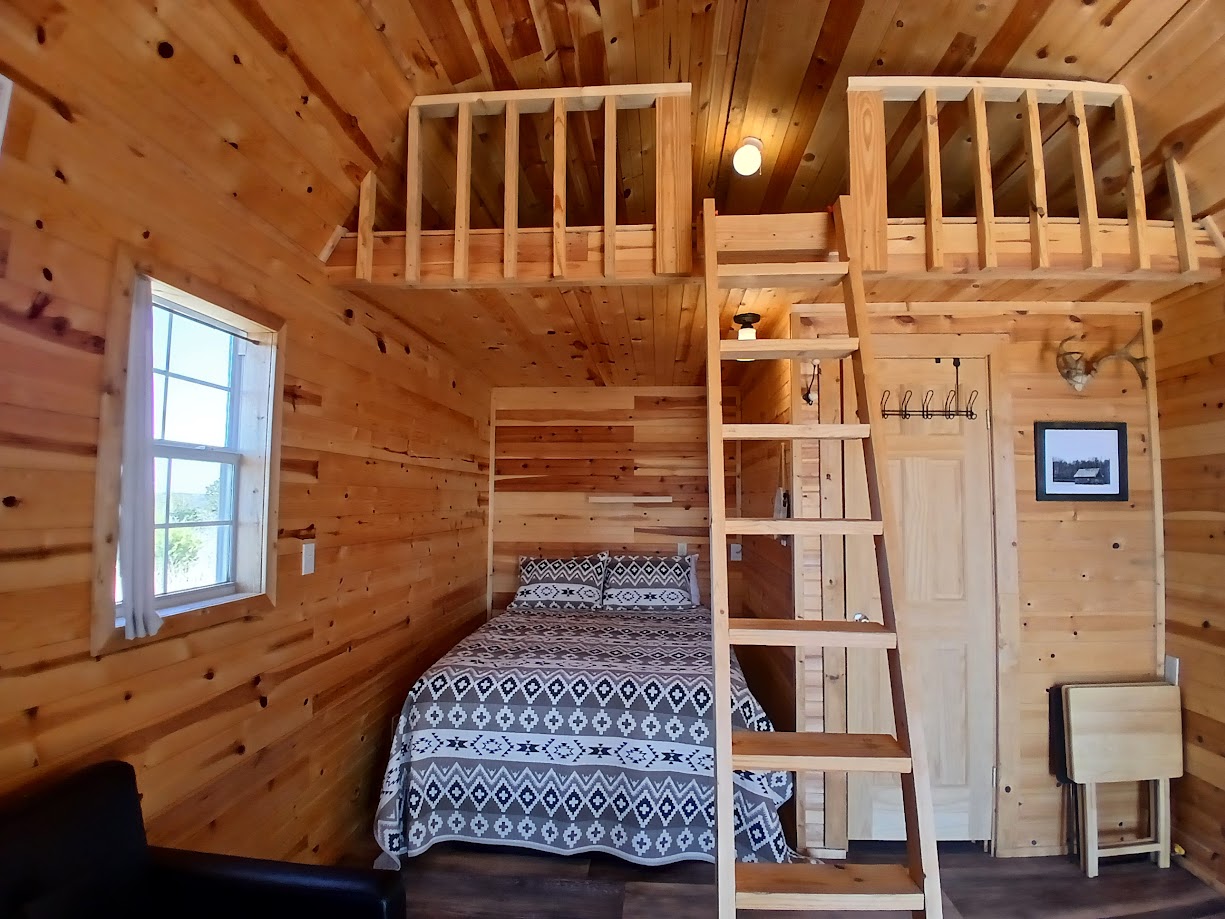 • Size: 324 sq ft cabin + 48 sq ft porch + 240 sq ft deck-sleeps 5